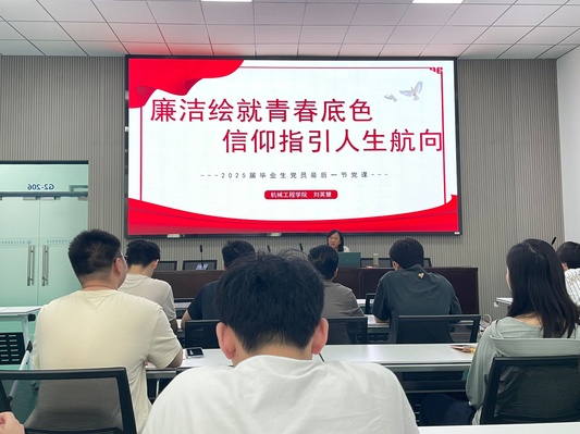 为进一步强化毕业生党员的廉洁意识与使命担当,筑牢廉洁自律思想防线,扣好廉洁从业“第一粒扣子”,5月27日下午,机械工程学院党委书记刘英慧以“廉洁绘就青春底色 信仰指引人生航向”为题,为2025届毕业生党员讲授离校前最后一堂党课,引导毕业生党员在新的人生征程中坚守初心使命,勇担时代重任。