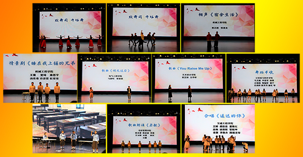 机械工程学院选手幽默搞笑的情景剧和相声让观众们回到那些年、那些事、那份往昔,那个睡在我上铺的兄弟,那段宿舍生活和那些匆匆脚步滑落下青春的足迹,这份深厚的友谊。电气工程学院选手轻浅浅的歌声最是动人,男声纯净,女声慵懒,像极了甜甜的初恋。艺术设计学院两个女生用温柔却掷地有声的声音唱出了一种不服输,超越自己的精神。商务贸易学院选手诙谐幽默的小品《上学那些事》,抑扬顿挫的朗诵《青涩那年》,伴随着柔和的歌声,追忆青春岁月。生活中,我们总会经历很多的事情,也会听到很多的故事,久了,有些也就渐渐淡了,忘了。但,那些曾路过我们心灵的声音和温暖一定还留在那里,支撑我们一路前行。计算机与软件学院选手的舞蹈不同于默舞团,她们的舞蹈多样轻快,几种不同旋律,不同的动作融合在一起,更加相辅相成,活泼可爱。经济管理学院选手激情澎湃的朗诵使现场观众产生了共鸣,“我来自一个平凡的世界,却想拥有一段不平凡的人生辉煌。”更是说出了大家的心声,要让心灵找到方向,让青春永远地飞扬。航空工程学院选手通过姿态、动作、对话、独白,展现了话剧的魅力,更表达了青年学生的爱国热情和不屈服命运的信念,体现了“解放思想,与时俱进,开拓创新,勇于奉献”的新生命力。交通工程学院选手用悠扬的合唱声诉说着青春,每个人心中都有着属于自己那一段青春岁月和那一个遥远的ta,但我们要相信:青春经不起等待,机会只垂青于有准备的人。