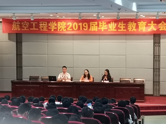 为了欢迎航空工程学院2019届毕业生顺利返校并确保毕业答辩顺利进行,帮助毕业生顺利办理离校手续和指导毕业生在工作岗位上更好的发展,航空工程学院于5月27日在学术交流中心报告厅举行2019届毕业生返校教育大会。航空工程学院原党总支副书记朱燕出席会议,共计324名2019届毕业生参加了此次大会,大会由辅导员孙瑛主持。