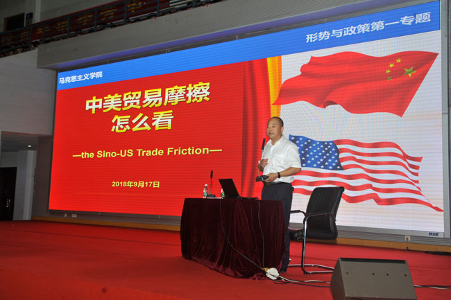 近日,星空体育登录官网_星空(中国)党委委员、纪委书记于林惠应马克思主义学院邀请,围绕当前中美贸易摩擦的热点问题,为2018级新生讲授形势与政策课“中美贸易摩擦怎么看”专题,引导学生正确认识中国发展与当前的国际形势。