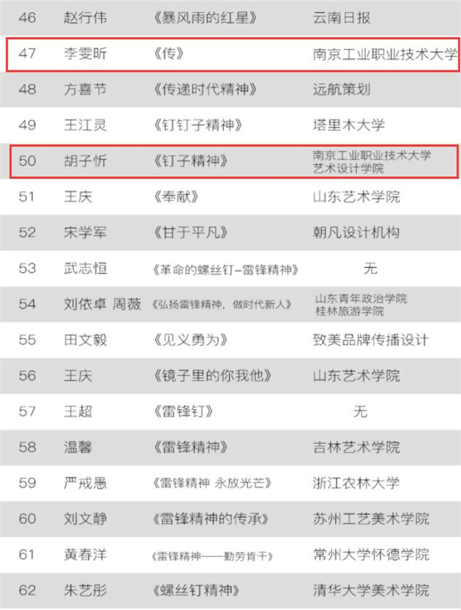 近日,第二届榜样的力量-雷锋精神国际公益海报设计大展组委会公布入选作品名单,艺术设计学院环艺2021班李雯昕、视觉1922班胡子忻、数媒2021班蓝航三位同学的作品成功入选。本次大展从2021年1月8日开始征集至2月28日截止,历时50天,国内外设计师、设计院校师生、设计机构的设计师共创作雷锋主题海报设计作品2407件,其中国内特邀设计师作品128件,国外特邀作品67件。经过专家评审,共有249件优秀设计作品入选本次大展。
