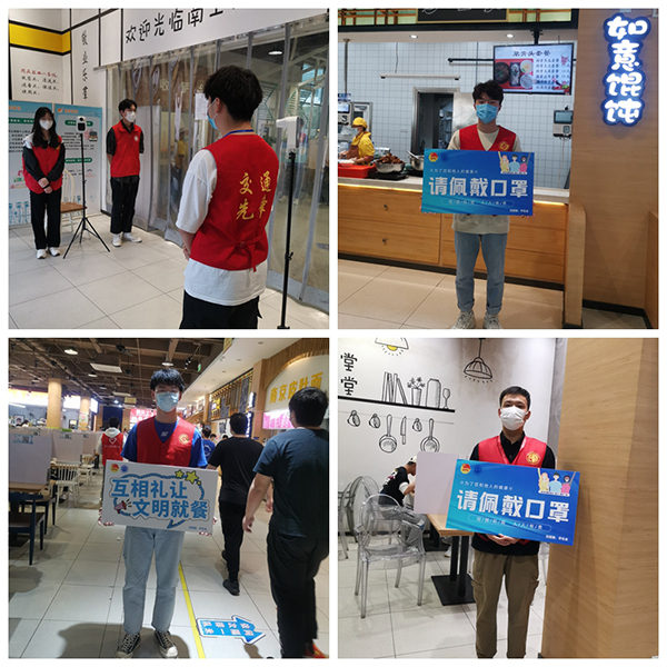 学生党员、入党积极分子、学生干部闻令而动,食堂门口、就餐位置旁、倾倒餐余垃圾处都可以看见志愿者们认真的红色身影,诠释着党员的责任、青年的担当。他们尽心尽力维护食堂就餐秩序,时刻提醒同学们佩戴好口罩、测量体温、排队保持安全距离、文明就餐。
