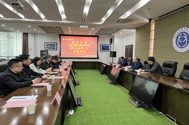 3月23日下午,武汉商贸职业学院校长马必学一行来星空体育登录官网_星空(中国)考察调研。党委常委、副校长霍雄飞以及党委办公室、校长办公室和商务贸易学院的负责同志在仙林校区行政楼辅楼二楼会议室接待了来宾。