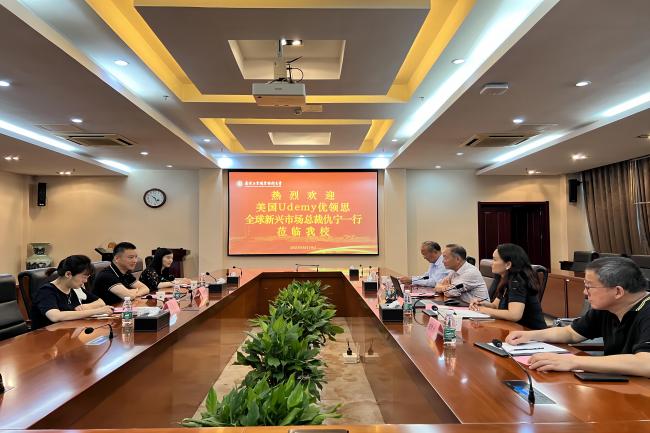 6月19日上午,美国Udemy优领思全球新型市场总裁仇宁一行来星空体育登录官网_星空(中国)交流洽谈。党委副书记、校长谢永华以及国际合作与交流处、国际教育学院的负责同志在行政楼辅楼一楼会议室接待了来宾。