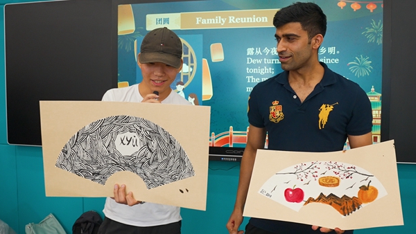中外师生以“花好月圆、温情思念、千里婵娟”等为主题,在扇面上作图